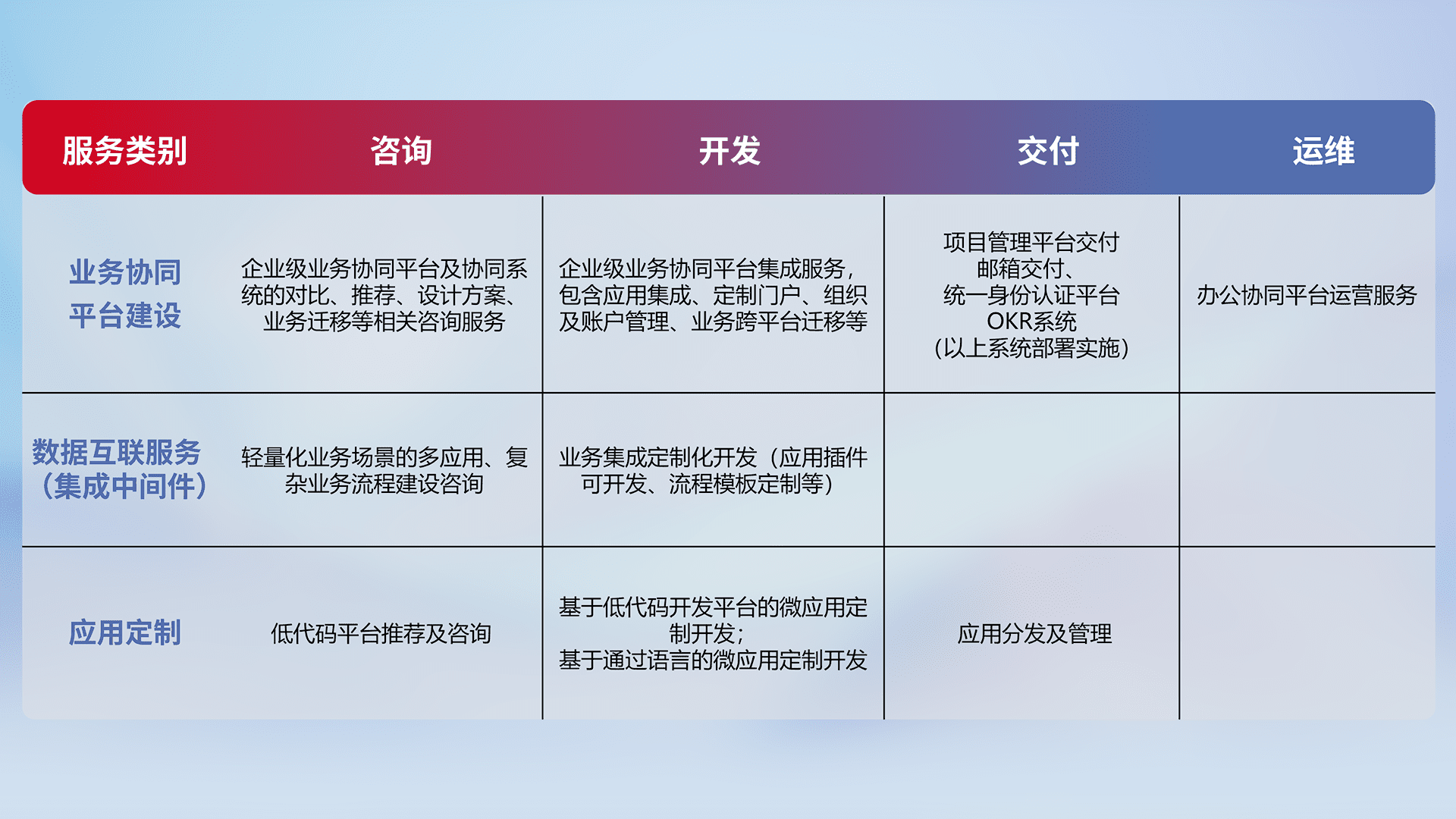 针对钉钉、、、企微、、IDaas等平台级产品提供产品的规划、、、、方案、、、、交付、、、、定制化开发等服务,,实现如统一协同办公、、、、智能客户服务、、、、混合会议管理、、、智能数据查询、、、等业务场景,,,,实现数字化转型。。。