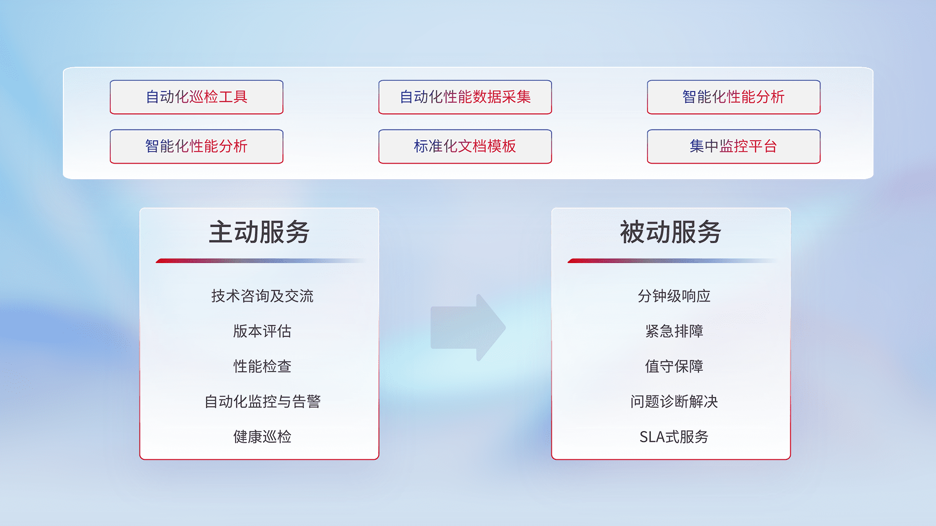 智能化工具和标准化文档,,保障服务质量,,提供主动服务(包含技术咨询、、、版本评估、、、性能检查、、自动化监控与告警、、、健康巡检)和被动服务包含(分钟级响应、、、、紧急排障、、、值守保障、、、、问题诊断解决、、SLA服务)。。